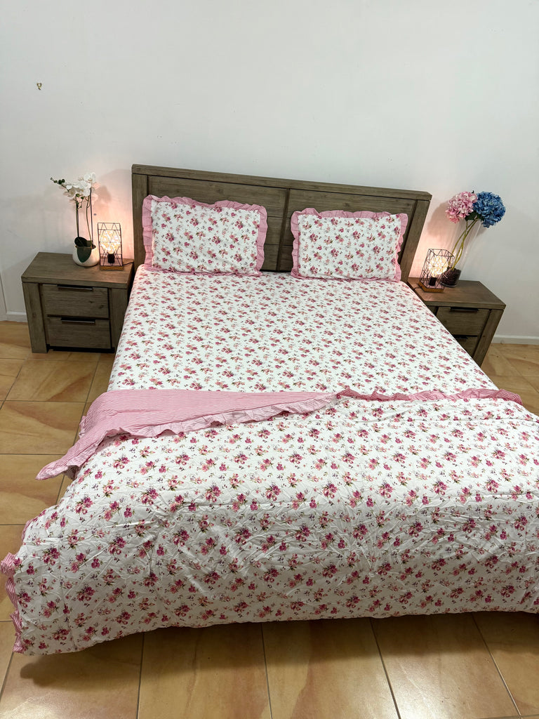 🟩 King Size Glacé Cotton Fitted Bedsheet with two pillow covers and matching Comforter (Fiber Filling in Comforter)